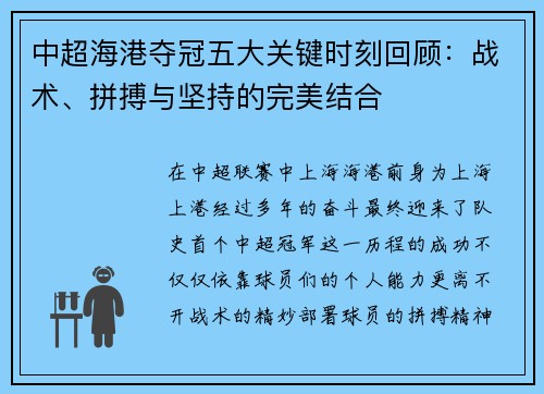 在中超联赛中,上海海港(前身为上海上港)经过多年的奋斗,最终迎来了队史首个中超冠军。这一历程的成功不仅仅依靠球员们的个人能力,更离不开战术的精妙部署、球员的拼搏精神以及坚持不懈的努力。在海港队的夺冠过程中,发生了多个关键时刻,而这些时刻共同组成了海港成功的基石。本篇文章将从四个方面回顾上海海港夺冠的五大关键时刻:战术的巧妙布置、球员的拼搏精神、球队的坚持不懈、以及团队的默契合作。每个方面都将通过具体事件进行详细阐述,揭示其中的细节与价值,以帮助读者更加全面地理解海港队夺冠之路的内在逻辑与意义。 战术是球队成功的关键之一,而上海海港能够在联赛中最终夺冠,离不开主帅的智慧与临场调整。在赛季初,海港队的战术体系就逐渐得到了完善。首先,主帅的防守反击战术为球队提供了足够的安全保障,利用快速反击来打击对方的防线,最大化发挥队内快速球员的优势。 其次,海港队在中场的控制也做得非常到位。通过引入一些技术型球员以及合理的人员搭配,球队能够在比赛中占据中场的优势,减少对方的进攻空间,同时增强自己进攻的组织能力。这种稳固的中场控制能力帮助海港队在关键比赛中保持稳定表现,并且能够根据对方的战术做出及时的调整。 此外,海港队的边路进攻是球队制胜的一大利器。球队主教练根据比赛的具体情况,灵活调整阵型,充分利用边路球员的突破和传中能力,不仅让海港队在进攻端富有创造性,也给对手的防线制造了很大的压力。正是这种灵活多变的战术体系,让海港在面对强敌时总能做到化解危机并抓住机会。 除了战术上的安排,海港队球员的拼搏精神同样是球队夺冠的重要原因之一。在多个关键时刻,球员们通过顽强的拼搏精神帮助球队逆袭或扭转局面,展现出了他们不屈不挠的态度。 特别是在面对实力强劲的对手时,海港队从不轻言放弃。无论是在客场作战还是面对技术流派较强的球队,海港的球员总能通过坚韧的防守与果敢的进攻,在场上屡屡逆转比赛。例如,在与广州队的关键比赛中,尽管球队在上半场一度落后,但球员们依靠强烈的斗志和拼搏精神,在下半场凭借精准的进攻和稳健的防守完成了逆袭。 球员们的拼搏精神在关键比赛中尤为突出,无论是前锋拼抢进攻机会,还是后卫奋力解围保护大门,每个人都为了最终的胜利而全力以赴。这种顽强的精神力量是海港队成功的基石之一,也让他们在比赛的关键时刻展现出了不可小觑的实力。 海港队的夺冠之路并非一帆风顺,在历经多个赛季的奋斗后,球队积累了宝贵的经验。这种坚持与耐心的积累,最终让他们在本赛季成功登顶。海港队的球员与教练组并没有急功近利,而是在每个赛季中保持稳定的发挥,并在困境中寻找到适合自己的突破口。 从战术上来看,海港队在不断优化阵容和战术的过程中,逐渐形成了属于自己的比赛风格。球队在最初的阶段,或许因为经验不足而未能在重要比赛中突破,但随着赛季的进行,球队在每一场比赛中都在积累经验,在不断的磨合中提升了整体实力。正是这种从容不迫、始终不急于求成的心态,才为海港最终夺冠提供了强大的支撑。 球员的坚持精神也体现在他们对待比赛的态度上。无论是比赛中的比分落后,还是伤病困扰,海港队员始终坚持不懈地向前奔跑,最终在赛季的关键时刻以坚定的信念逆转局势。通过每一场比赛的坚持与努力,海港队逐步接近冠军,实现了多年期盼的目标。 虽然上海海港队拥有一批技术出众的球员,但夺冠的关键在于全队的团结合作。在许多时候,海港的成功不仅依赖于单个球员的能力,更依赖于整个团队的默契与协作。无论是防守中的协同作战,还是进攻中的配合配合,海港队员们始终保持着高度的团队意识。 尤其是在防守端,海港队通过整齐的站位和默契的协作,成功地化解了对方的进攻威胁。在每一场艰苦的比赛中,球员们的防守不仅仅是个人能力的体现,更多的是通过团队的力量,确保了防线的稳固。在进攻方面,海港队则展现出了前场球员之间的相互配合,通过传递、跑位和配合制造机会,使得进攻更加具有威胁。 海港队在夺冠过程中,球队的士气与凝聚力得到了极大的提升。每个球员都为球队而战,不单单是为了个人的荣誉,而是为了整个团队的目标与梦想。这种团队精神,不仅仅是在比赛中体现,也渗透到球队的日常训练与生活中,成为了海港队成功的重要原因。 总结: 上海海港的夺冠之路,是战术、拼搏、坚持与团队合作的完美结合。战术的灵活部署让球队在关键比赛中能够迅速反应,球员的拼搏精神帮助球队在逆境中取得突破,而坚持不懈的努力则确保了海港队能够持续在赛季中稳定发挥。而最为重要的是,全队的协作与团结,成就了海港队在关键时刻的强大实力。 总的来说,海港队的夺冠不仅仅是技术层面的胜利,更是精神层面的成功。通过多年的积累与不懈奋斗,海港队成功实现了自己的梦想。这一过程中的每一个关键时刻,都是球队整体力量的体现,也是每一位海港球员与教练员辛勤努力的结果。未来的海港队将继续在战术创新和团队合作中追寻更高的荣誉。1、战术布置的巧妙与灵活
